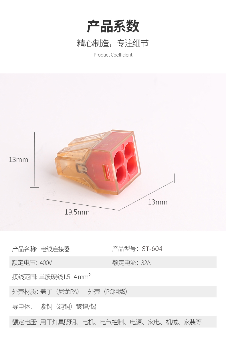 額定電流:400A額定電流:32A導(dǎo)線線徑:1.5-4mm²耐電壓:AC2500V/1Min機(jī)械性能環(huán)境溫度:-40°C~+105°C剝線長度:12mm尺寸:19.5*,9.2*,13.1材質(zhì)及電鍍塑件:PC,UL94V-2彈片:不銹鋼觸點(diǎn)材料:電解銅鍍鎳錫
